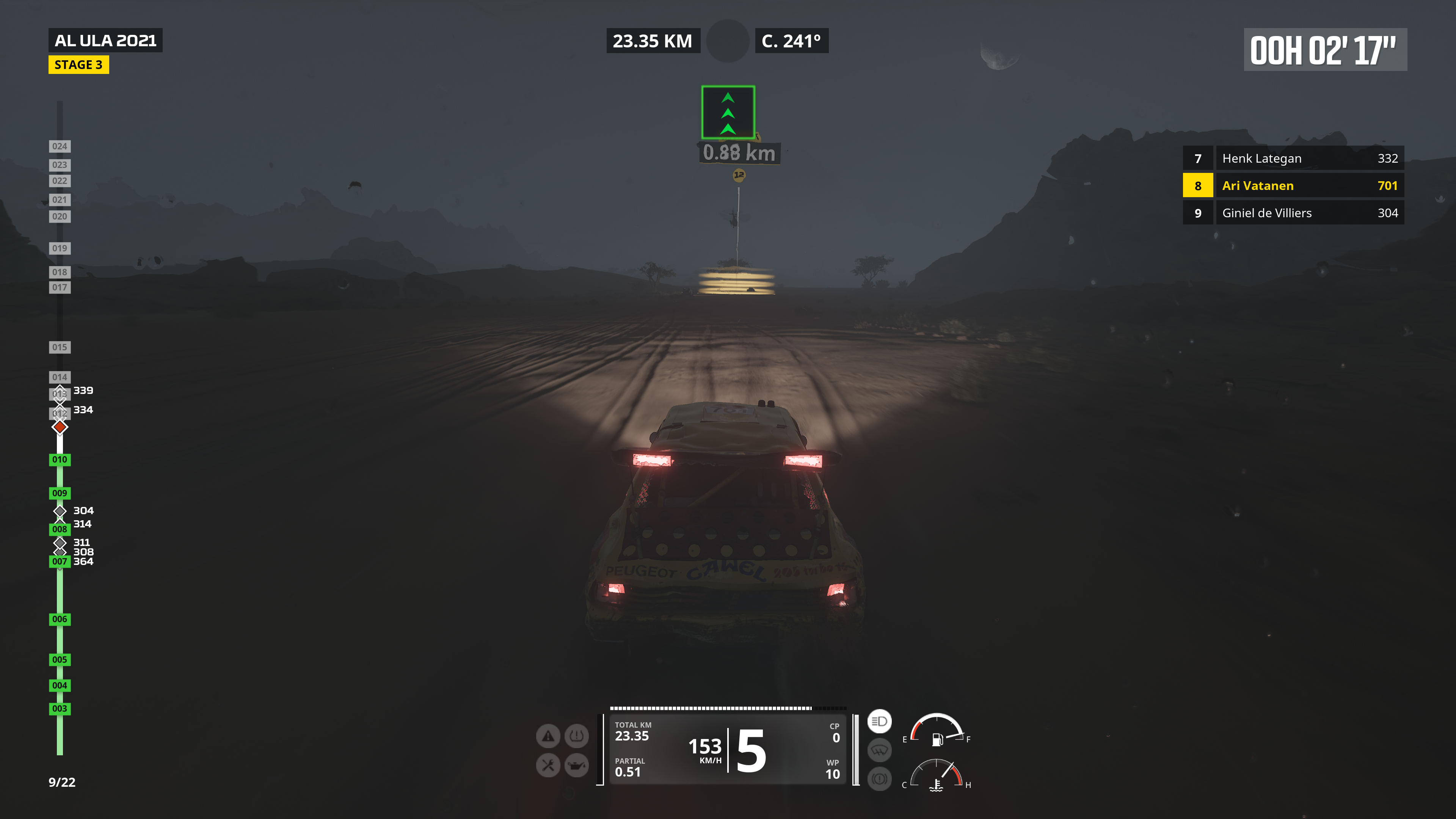Your progress through the stage is tracked by a vertical progress bar on the left of the screen. Validated waypoints are denoted in green (with waypoint number) while your current position is marked by a red diamond.