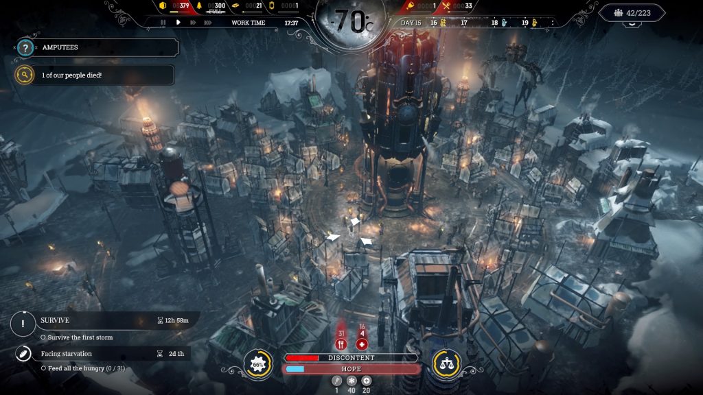 Well, the generator kicks out heat in a radius around it. Build tents where people will stay warm, sounds obvious really. More people turn up and you need more tents, you have used up the inner circle though, so you have to build outside the heat zone. Upgrade your generator to a larger heat zone, but this consumes more coal, move your resources around to get more coal, but now the hunter’s hut is understaffed and less food is getting to the city. Frostpunk allows you to really micromanage your teams, there is a lot to stay on top of, and it’s not by any stretch of the imagination an easy game. I failed to make it to double digits in days at the first attempt. The pause function is very much needed, think about your next move very carefully before executing it.