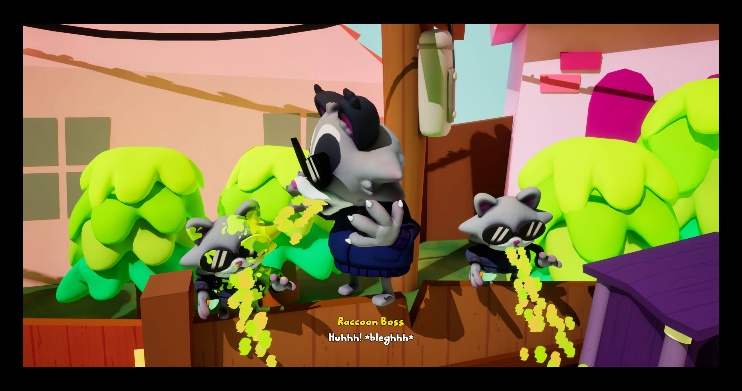 A screenshot from Grandma, No! A raccoon boss in sunglasses spews green liquid, flanked by two smaller raccoons, all set against a colourful backdrop of trees and buildings.