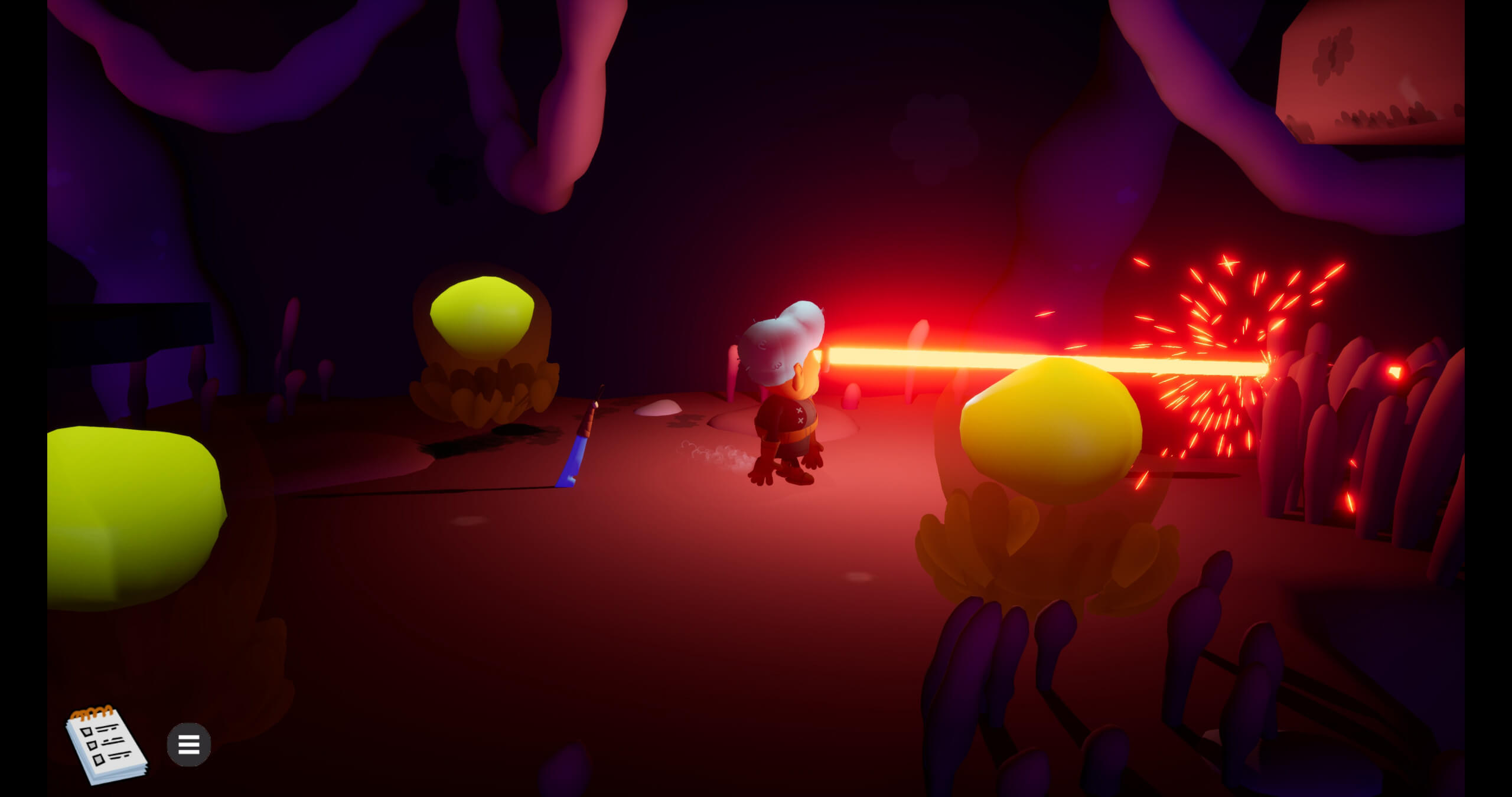 A screenshot from Grandma, No! A character in a dark, colourful environment shoots a red laser at targets surrounded by glowing yellow alien-like plants.