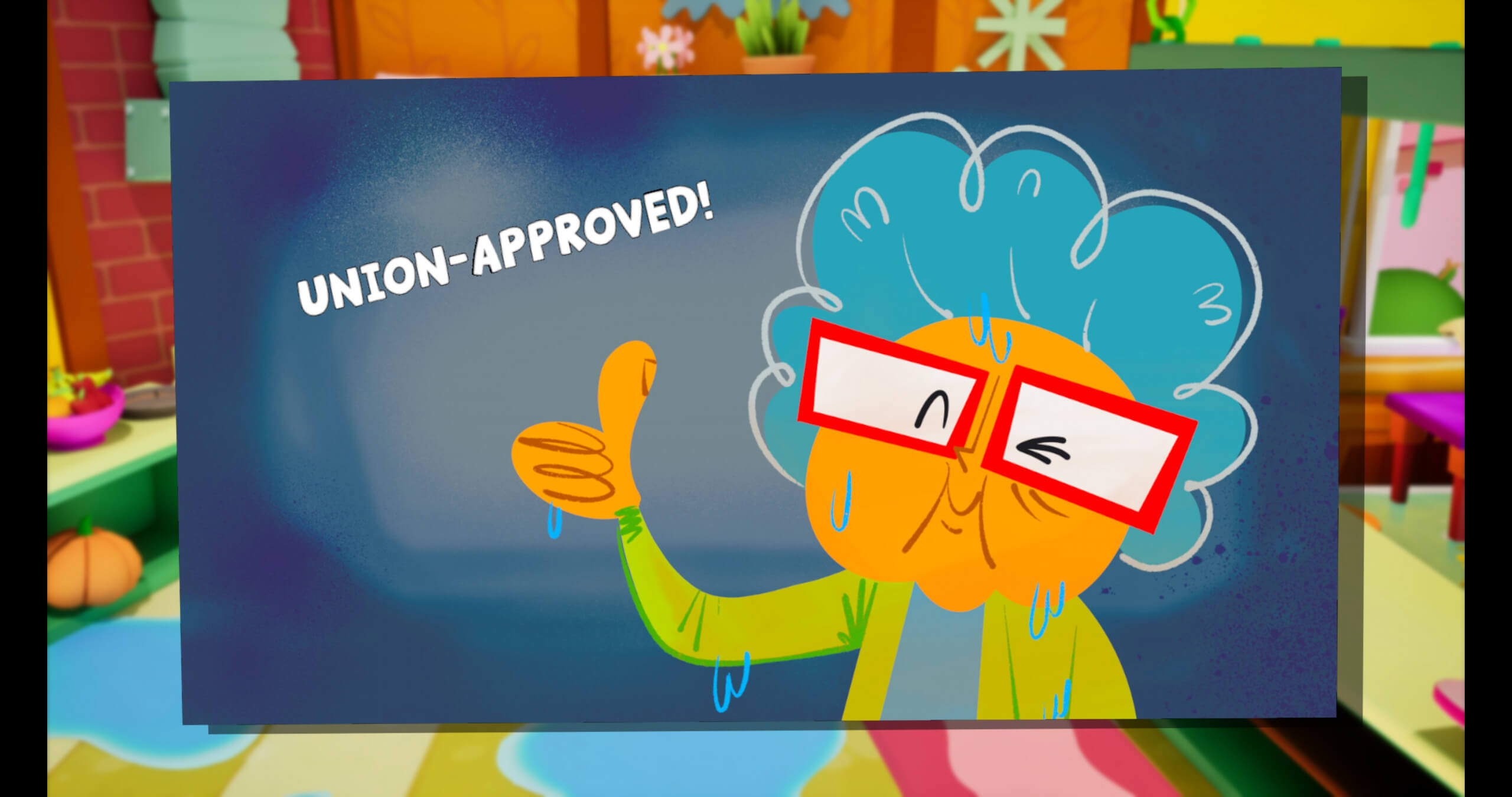 A screenshot from Grandma, No! A cartoon character with bright blue hair and red glasses gives a thumbs up, with the text “UNION-APPROVED!”.