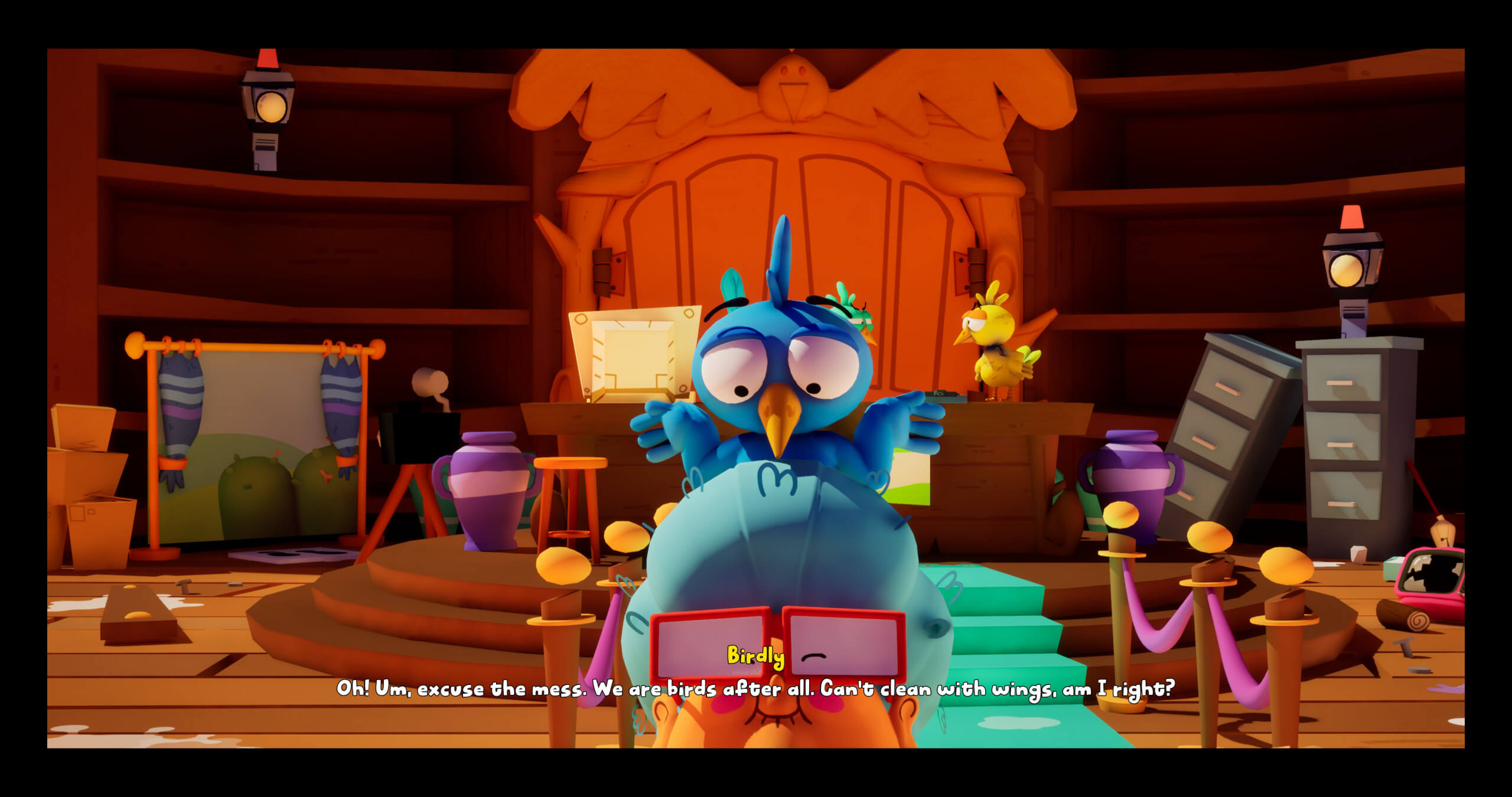 A screenshot from Grandma, No! A blue cartoon bird, Birdly, humorously comments on their messy environment, while a yellow bird looks on. The room is cluttered with items.