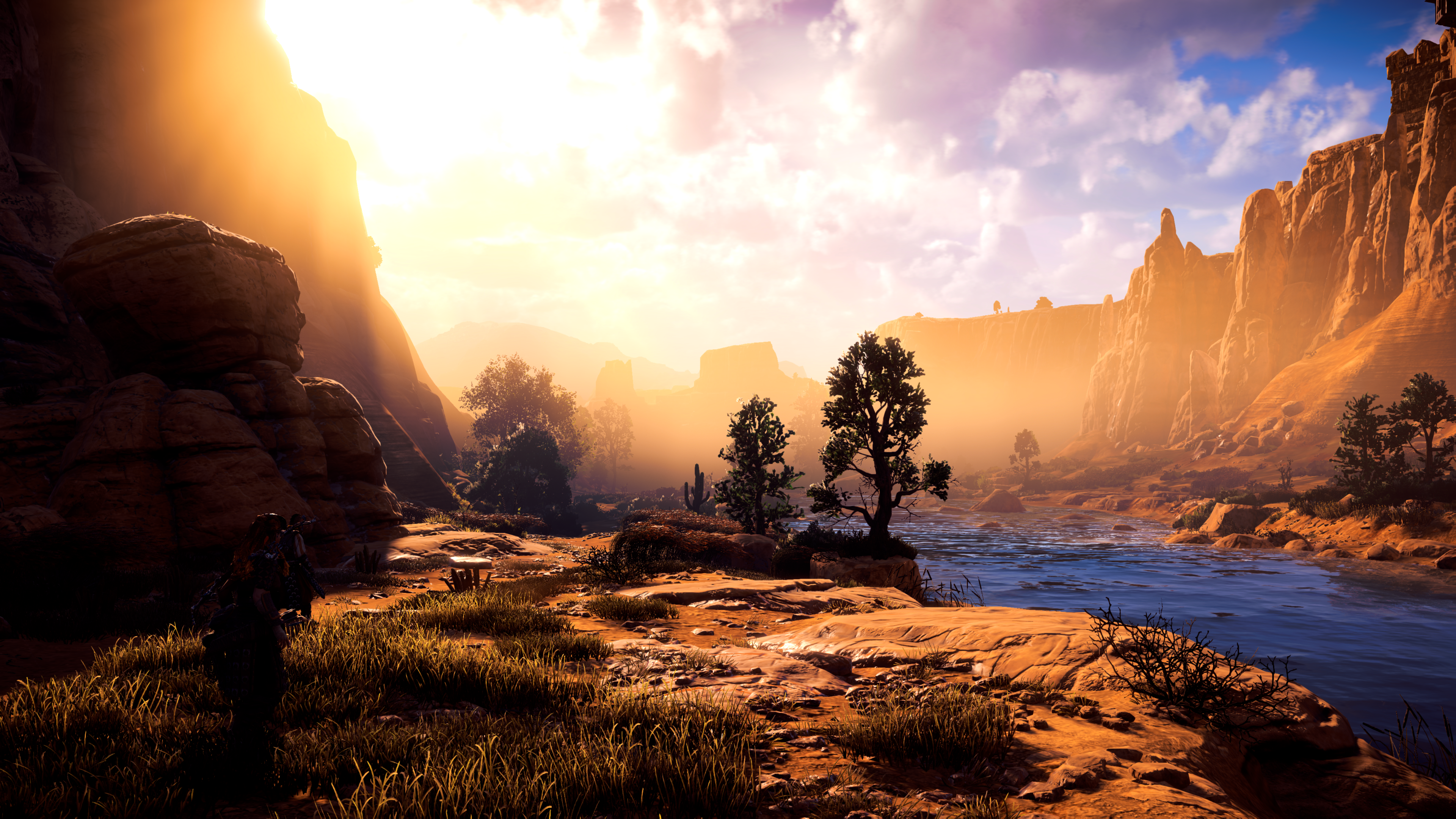 The world itself is just plain beautiful. From witnessing a crimson sunset across a mountain range to seeing the land naturally shift from a desert to a lush jungle, Horizon made the act of running from location to location within its world a huge part of the fun.