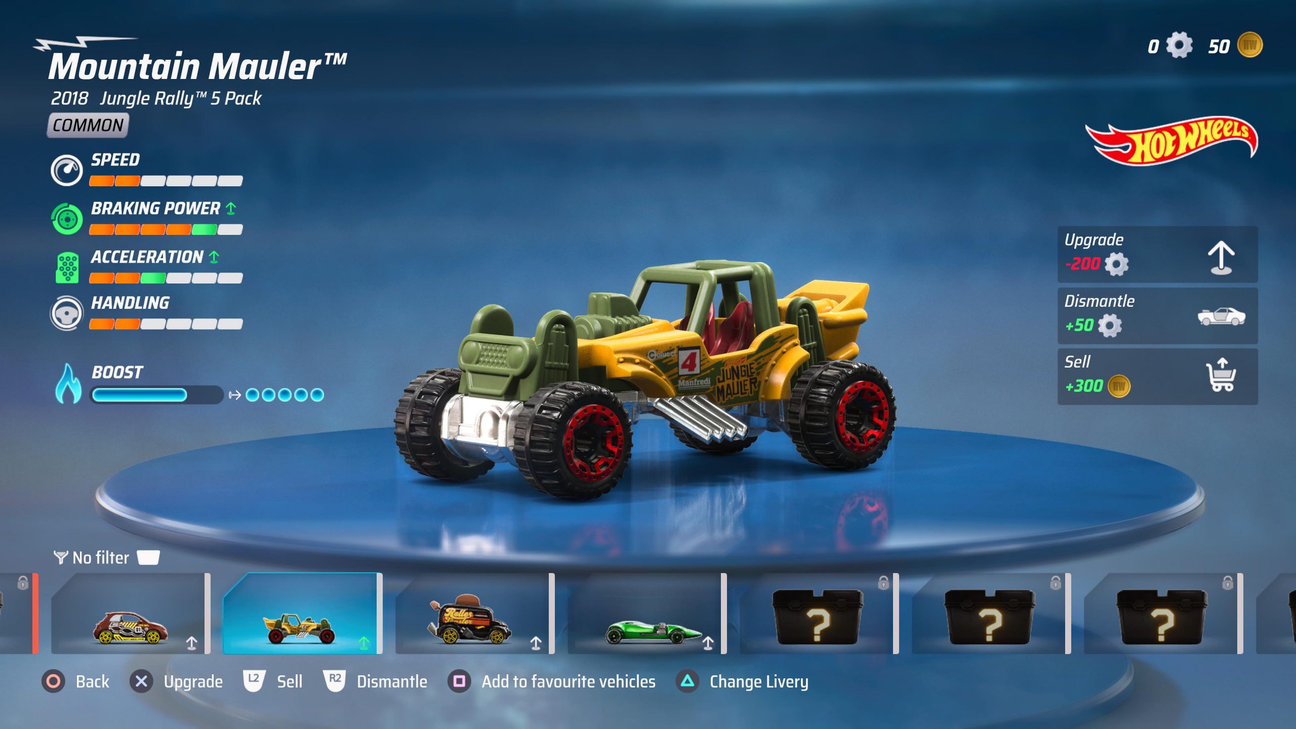 The vehicle stats are split into a number of areas, Speed, Braking Power, Acceleration, Handling, and then finally the Boost Type. All of which are generally self-explanatory and are easy to understand. If you have opened a Blind Box you are able to sell those cars, either for gears or coins depending what you are currently trying to collect.