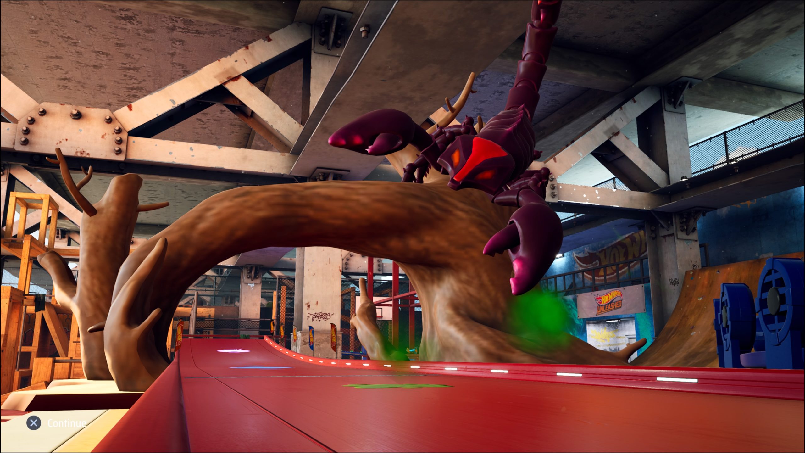 The Boss Races in particular need a mention, these unlock a great number of bits and bobs, but the one thing they do unlock is a super track piece. It may be the scorpion below, or even a dinosaur head to add to your own tracks in the Track Builder. There is plenty to do in Hot Wheels Unleashed
