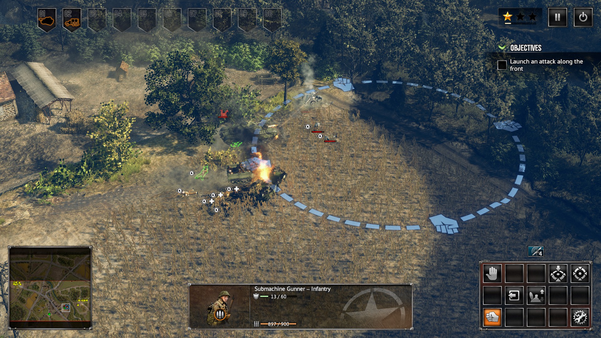 In Sudden Strike 4 the troops move quite realistically, they take cover in undergrowth, will get in vehicles and crawl very slow when half dead. It is very easy not to appreciate the quality of the game if you just rush in to every scenario without thinking tactically. All units behave differently, learn their strengths and weaknesses. Flank your opponent if you can, get round the back and rocket his exhaust. Use the terrain to your advantage, it could be the difference between death and taking longer to die. Attacking head on might get you a medal, and I’m sure your kids will treasure it, but you simply will not get to the next round.