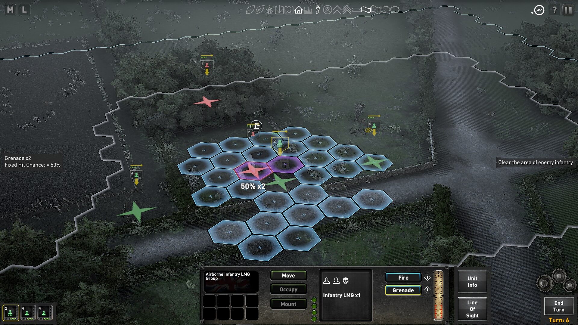 Woodland and orchards block fire beyond a certain depth, displayed by a purple hex. Grenades are not affected by movement and ignore cover but can only be thrown into buildings if your unit is adjacent. The yellow slider indicates your Steadiness. Steadiness dictates the accuracy of shooting attacks. Reduce Steadiness by moving or suppression from enemy fire. If a unit’s Steadiness falls to zero, it’s counted as a Final Action, ending its turn.