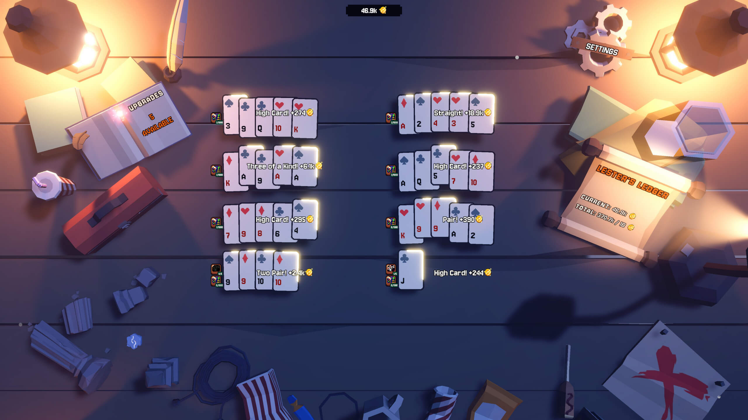 This Ain’t Even Poker, Ya Joker has you meeting with a Jester, who is holding you hostage. Saying you’ll need to make 1 billion coins in order to release you. You start off with one card and will need to earn coins to unlock more cards to make a hand. The coins can be used to either increase your cards or in the upgrade tree. Which once you get to 1 billion coins, ends up being that the Jester was a liar. WHAT A TWIST?!