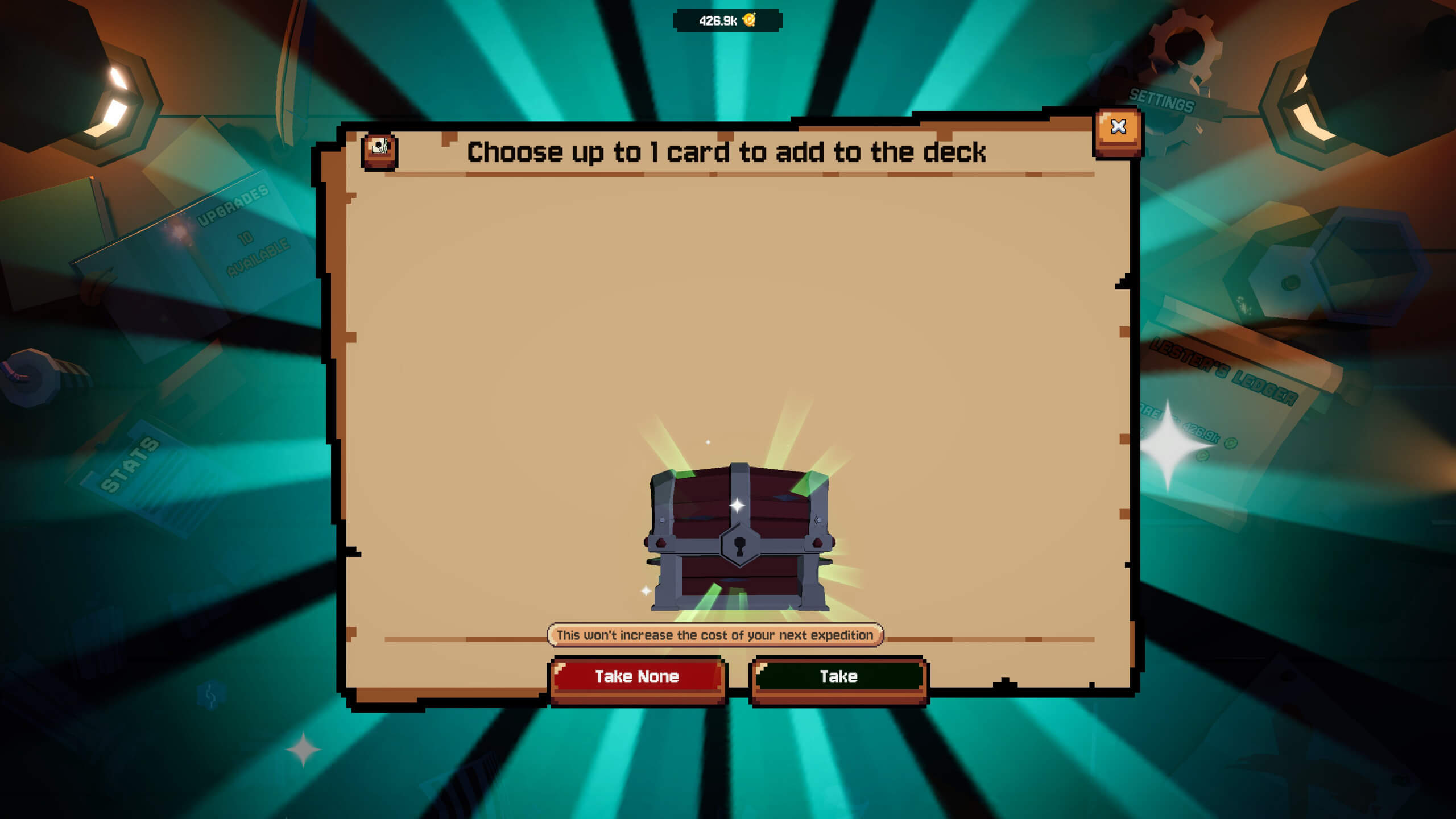 Game interface prompting to choose one card to add to the deck, with options to "Take None" or "Take". Background beams of light.